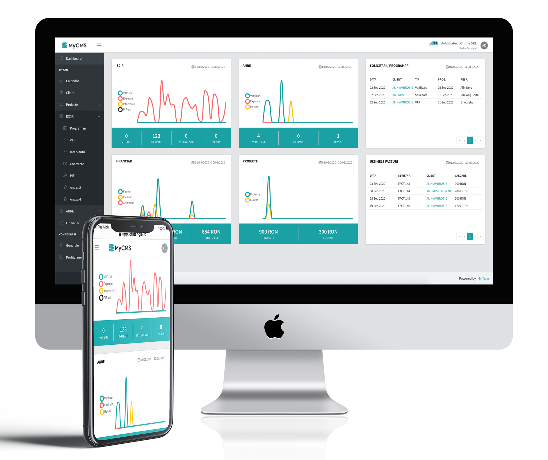 MyCMS combină module specializate pentru activitățile tehnice cu instrumente moderne de management și facturare.